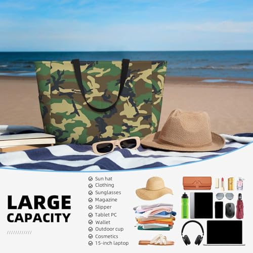 Green Military Camo Print Roomy Beach Tote Bag For Women, Large Travel Bag For Weekend Travel,Pool 6