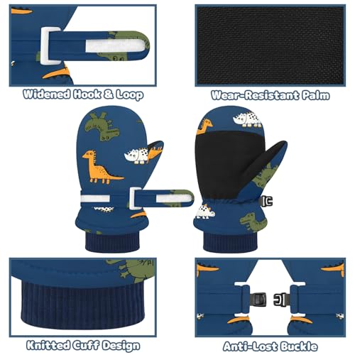 • IDEAL ACCESSORY FOR WINTER ACTIVITIES: To meet the preferences of different children, the toddler mittens are designed in solid colors and dinosaur patterns that can easily match various winter clothes and stimulate baby's curiosity. As thermal accessories for snow adventures, our baby snow gloves are perfect for skiing, sledding and making snowmen to add more warmth. Moreover, these baby gloves can also be wonderful gifts choice for birthdays, Christmas, New Year and other special occasions.
