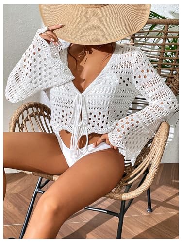 • Feature: Hollow Out, V Neck, Flare Long Sleeve, Tie Front, Crochet Knit, Lightweight, Sheer, Crop Length, Kimono Cardigans for Women