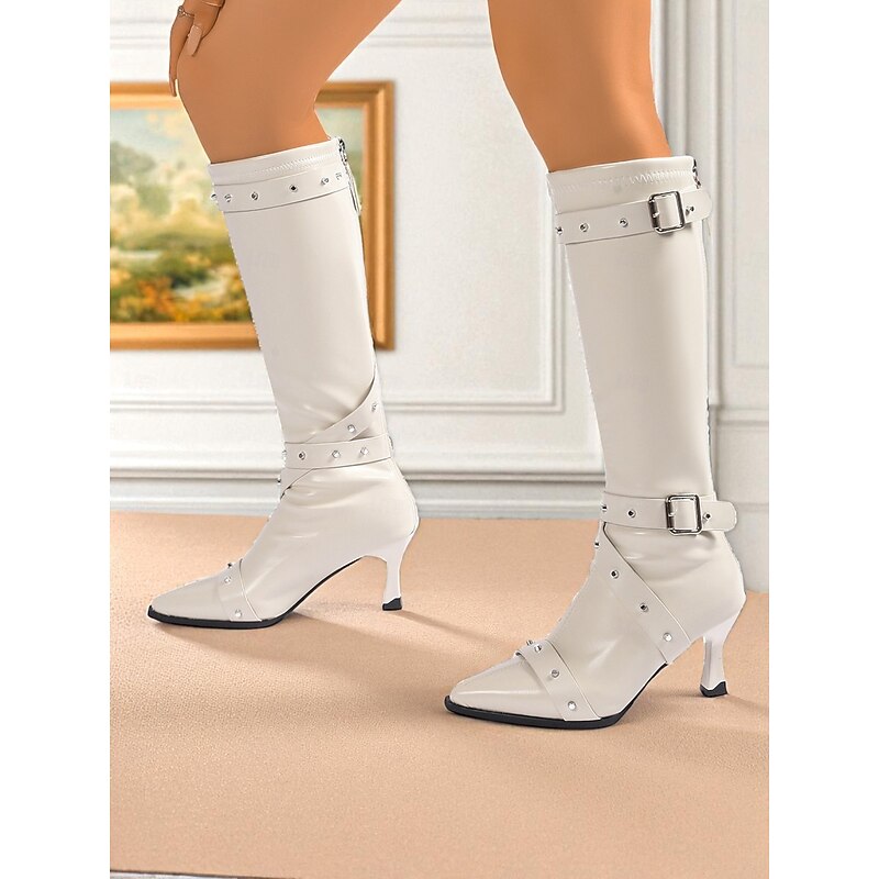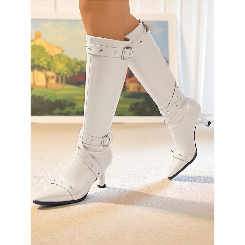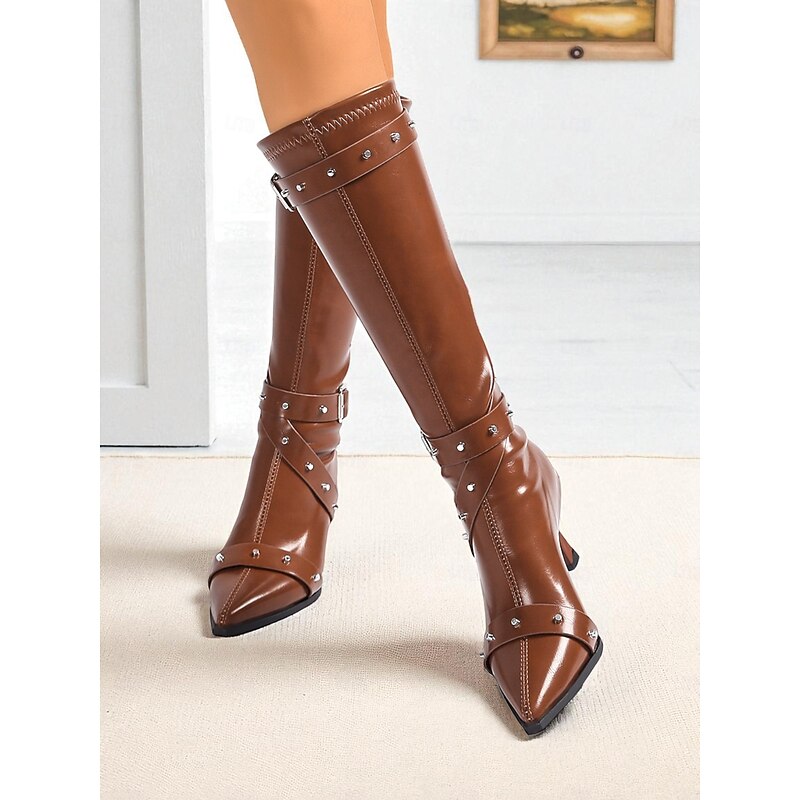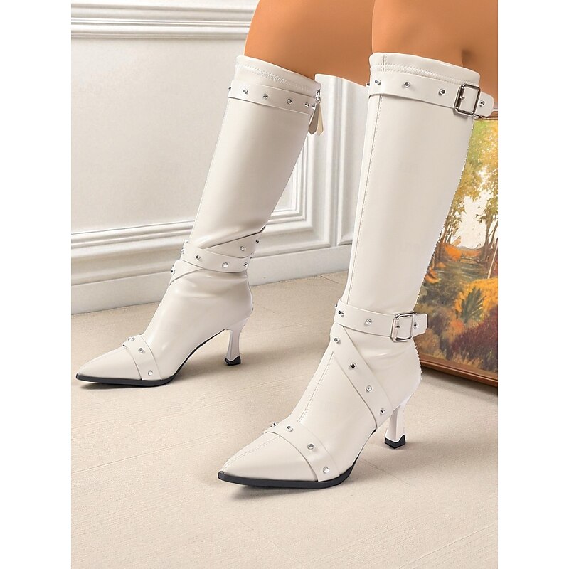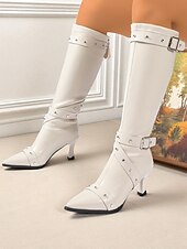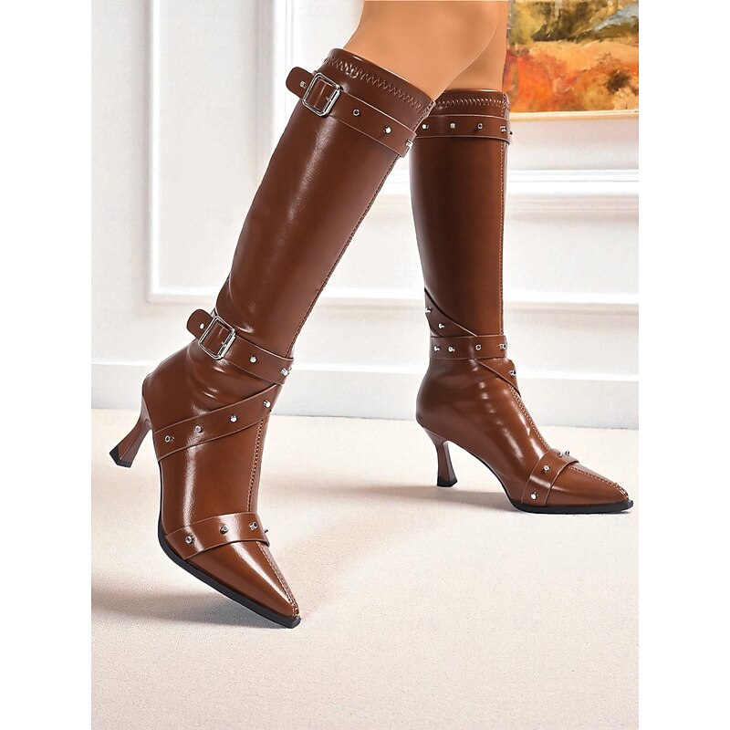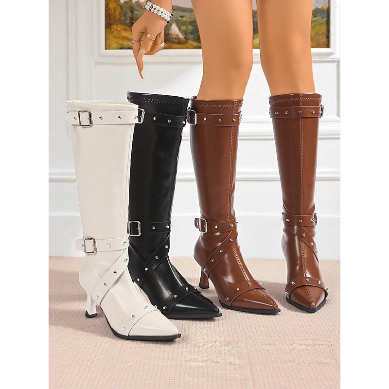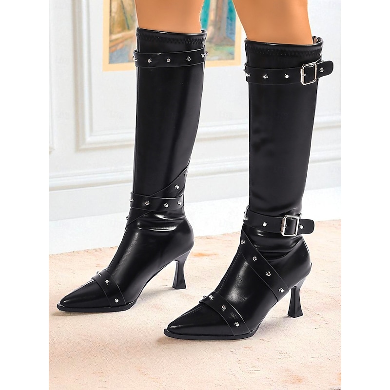 HOT ! Women's Black Knee High Boots with Studded Buckle Straps and Pointed Toe, Gothic Punk Fashion Heeled Boots for Night Out & Cosplay Parties