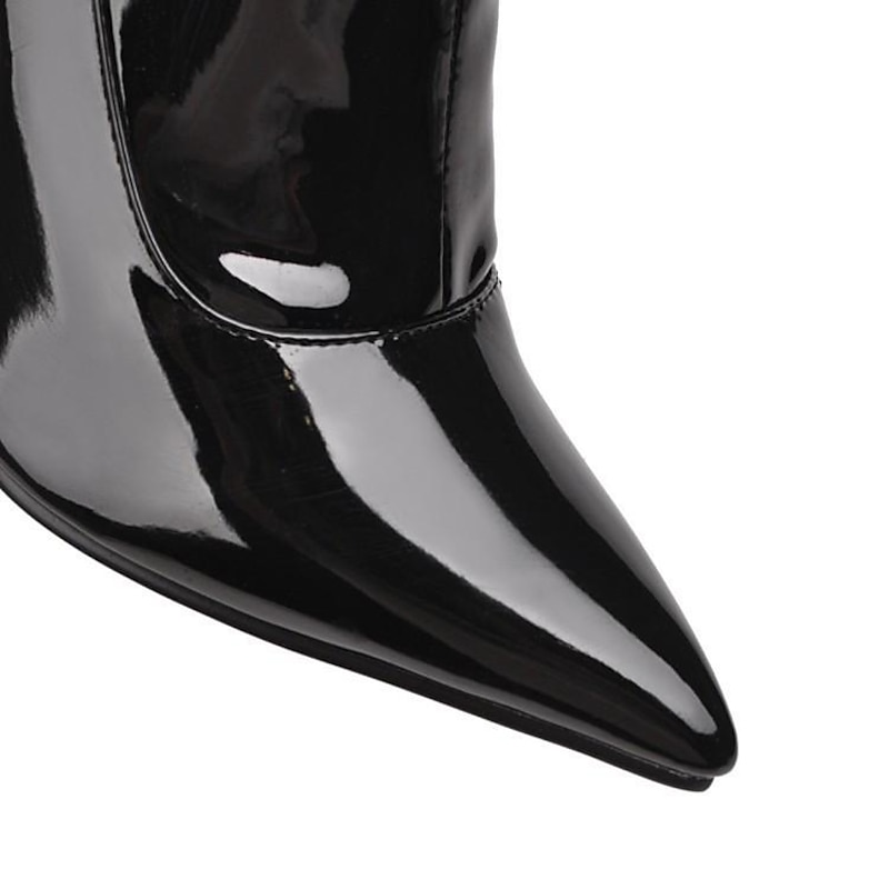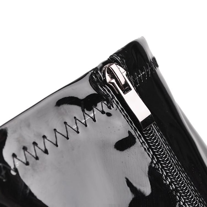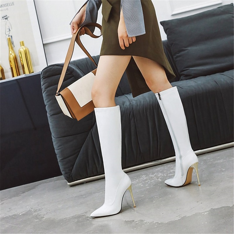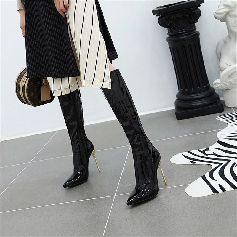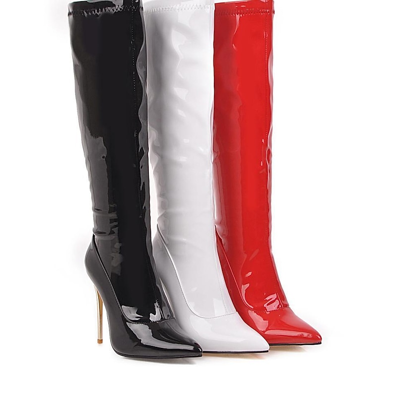 Highlights [Fabric:] Crafted from glossy patent leather, these knee-high boots boast a vibrant sheen that enhances their appeal, while offering durability and ease of maintenance. [Fit:] Featuring a structured silhouette, these boots provide a comfortable yet stylish fit that perfectly hugs the contours of the leg, accentuating a sleek and elongated look. [Design Highlights:] The boots showcase a modern pointed toe and a high stiletto heel for an added touch of elegance and sophistication. With a convenient zipper closure on the inside, they are easy to slip on and off, ensuring both style and practicality. Available in classic black, white, and bold red, these boots allow you to make a fashionable statement on any occasion. [Occasions:] Perfect for Valentine's Day celebrations, daily wear, or any occasion that demands a touch of style. These boots seamlessly transition from casual gatherings to more formal events, making them a versatile addition to any wardrobe. [Size Range:] Available in a variety of sizes, including US5 to US12.5, these boots cater to different preferences, ensuring a personalized fit for various foot shapes and sizes.