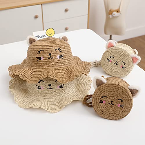 Girl Summer Wide Brim Floppy Beach Sun Hat Cute Straw Hat Woven Pocket with Cat Ears Suit for Outdoor Activities 7