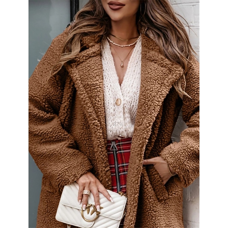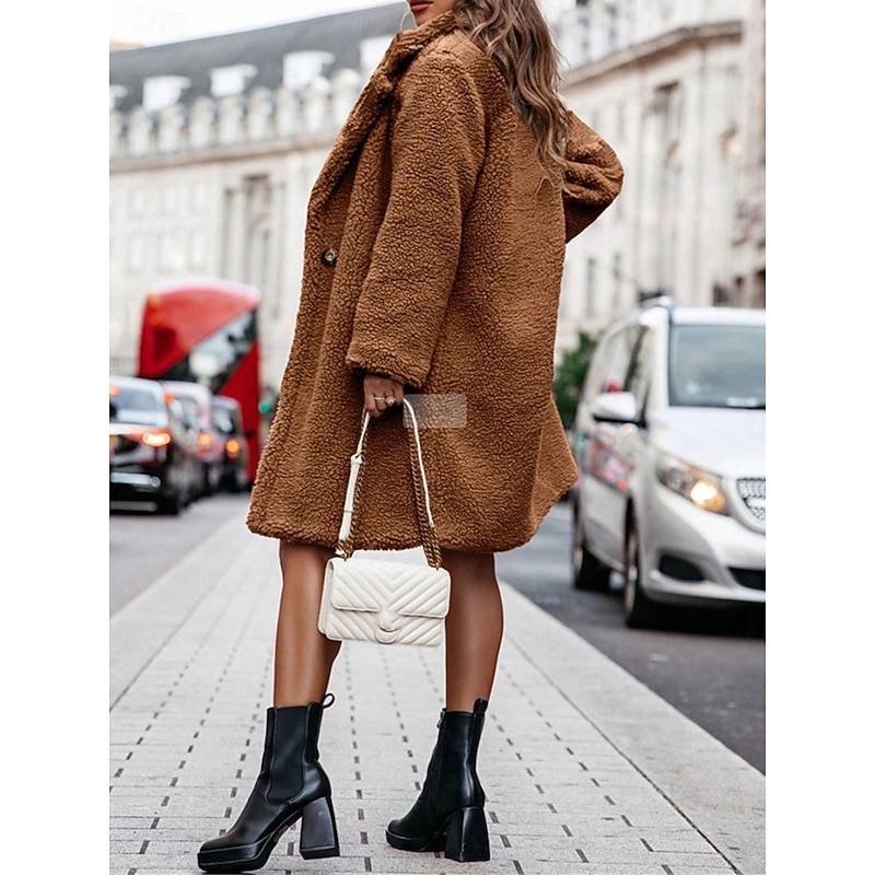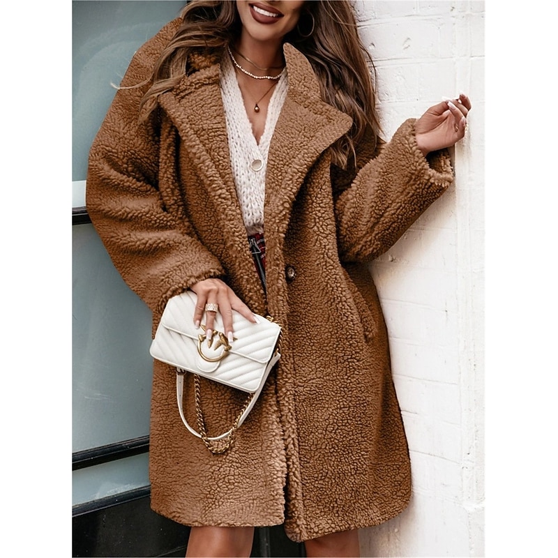 Highlights [Fabric] : Crafted from premium polyester and sherpa fabric, this women's fleece jacket offers warmth and breathability, perfect for the cooler Fall and Winter months. The plush texture adds a touch of luxury, ensuring you stay cozy in style. [Fit] : Designed in a regular fit, this jacket provides comfort and versatility. Its classic cut allows for easy layering, making it an essential outerwear piece for varied occasions. [Design Highlights] : The coat features a timeless single-breasted closure with a turndown neckline, adding a sophisticated element to its design. Practical pockets and a fleece-lined interior increase the functionality and comfort of this piece, making it a go-to option on chilly days. [Occasions] : This teddy coat is ideal for daily wear, street outings, vacations, or a casual day going out. Its ability to blend seamlessly with both casual and dressy outfits makes it a versatile addition to any wardrobe. [Size Notice] : Available in sizes S, M, L, XL, and 2XL, this jacket accommodates various body types, providing a flattering fit for everyone. The neutral khaki and apricot color options add to its adaptability, ensuring a perfect match with your existing wardrobe essentials.