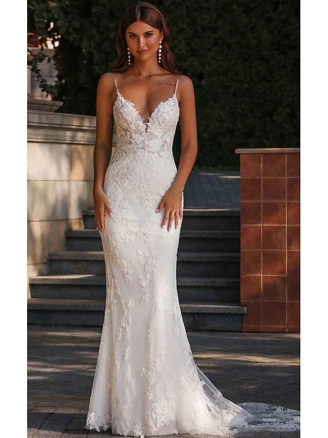 More information about Wedding Dresses Mermaid / Trumpet V Neck Spaghetti Strap Sleeveless Court Train Lace Bridal Gowns With Embroidery Appliques