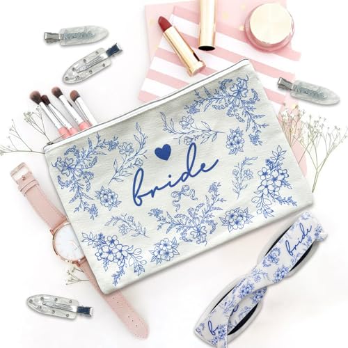 • Bride Makeup Bag: Featuring a striking "Bride" script in classic blue-and-white pattern, this versatile bride bag serves as both a stylish purse and essential bridal accessory. Its fashionable design adds sophistication to engagement parties, weddings, and bachelorette parties.