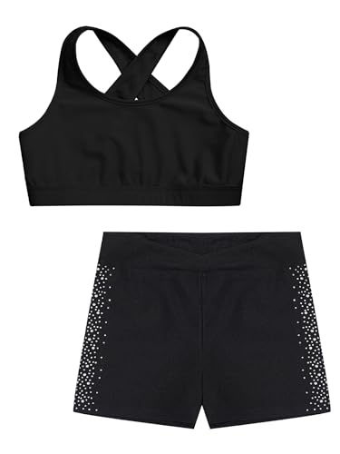 Kids Girls 2 Pieces Outfits Sports Suit Cross Back Sleeveless Sport Bras with Rhinestones Shorts for Sport Dance 6