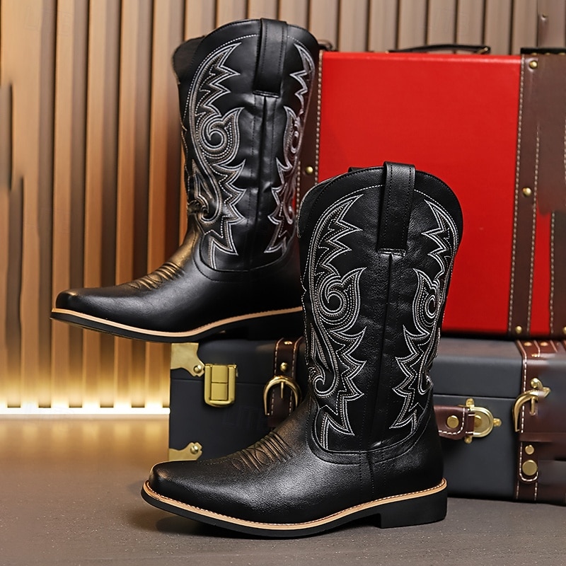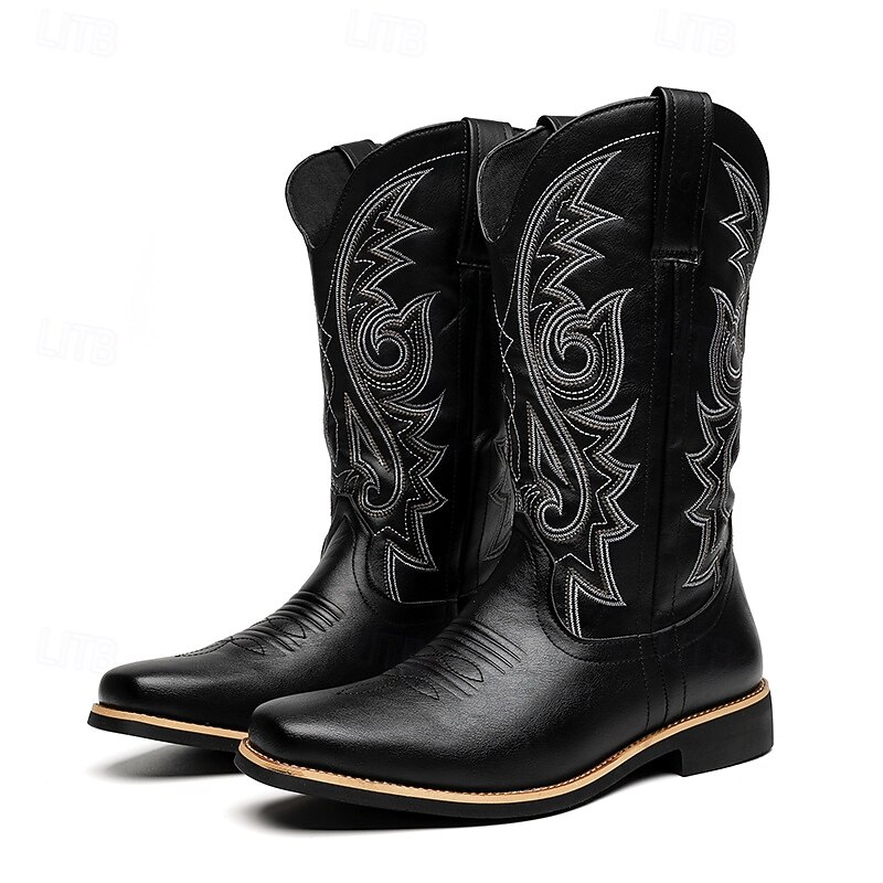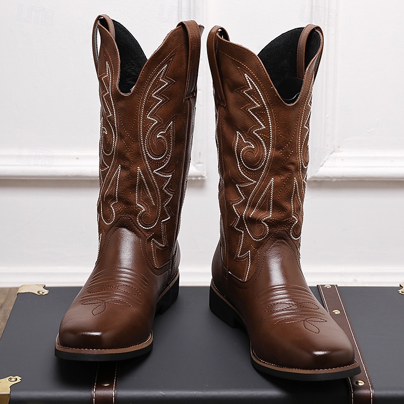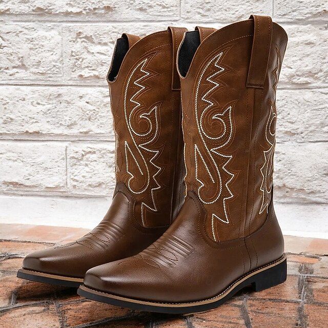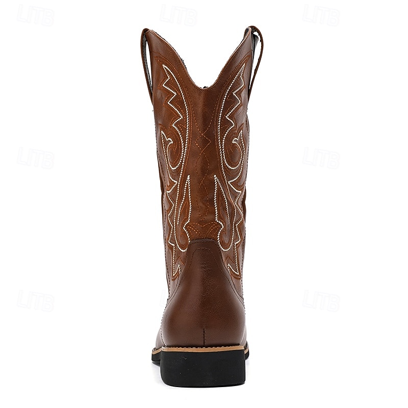 Highlights [Fabric] These Men's Classic Brown Western Cowboy Boots are crafted from high-quality PU leather, ensuring durability and a sleek finish that enhances both style and comfort. [Design] Featuring intricate white embroidery along the shaft, these boots capture the essence of traditional Western design. The round toe and solid heel provide ample support and stability, while the pull tabs make it easy to slip them on and off. The boots also include a zipper closure for added convenience and a secure fit. [Design Highlights] The intricate detailing and smooth leather finish offer a timeless appeal, making these cowboy boots a rugged fashion statement. The rubber outsole offers slip resistance, making these boots practical for daily wear. [Occasions] Perfect for outdoor activities, casual outings, or adding a touch of Western flair to any ensemble. These boots are versatile enough for both practical use and stylish occasions, making them a great addition to any wardrobe. [Size Range] Available in a wide range of sizes, from US7 to US12, ensuring a comfortable fit for different foot sizes.