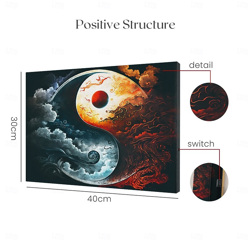 Highlights [Fabric] : Crafted from high-quality nonwoven material, this LED canvas wall art boasts a durable textured surface. The canvas is meticulously stretched over a sturdy wooden frame, ensuring longevity and a professional finish, ready to enhance any room with ease. [Style] : Designed with a classic theme, this artwork features an intricate 3D printed yin-yang motif. The seamless blend of fire and water elements symbolizes balance and duality, while the swirling clouds and fiery textures on either side add depth and intrigue to the design. [Design Highlights] : The piece masterfully contrasts cool blues against vibrant reds, creating a mesmerizing visual impact. The incorporation of dynamic elements of light and darkness further emphasizes its philosophical theme, transforming any space into a sophisticated haven of harmony and equilibrium. [Occasions] : Perfect for various settings such as the living room, office, or meditation area, this LED canvas art serves not only as décor but also as a reminder of tranquility and balance. Whether for personal inspiration or as an eye-catching addition to a communal space, it enhances the ambiance with its profound aesthetic. [Size Notice] : Available in the size 30 x 40 cm (11.8 x 15.7 inches), this artwork is ideal for a range of spaces, providing flexibility in placement and arrangement to suit your style and environment.