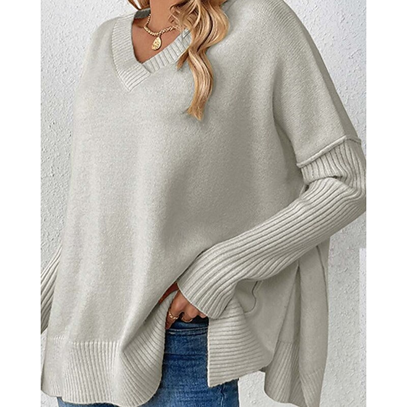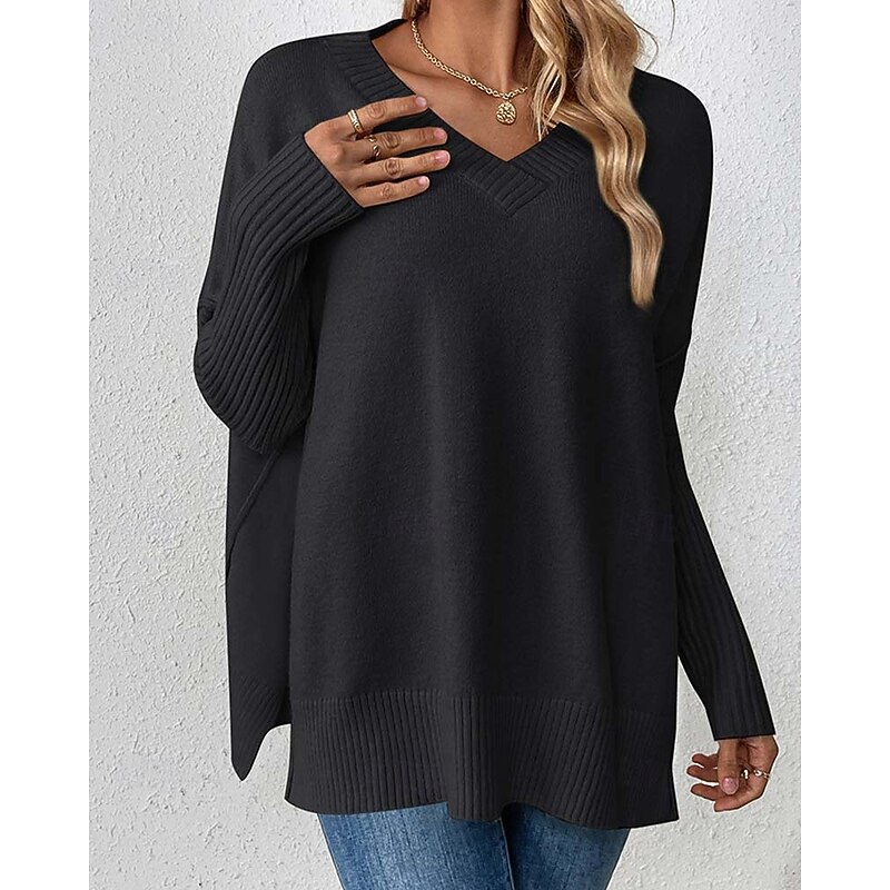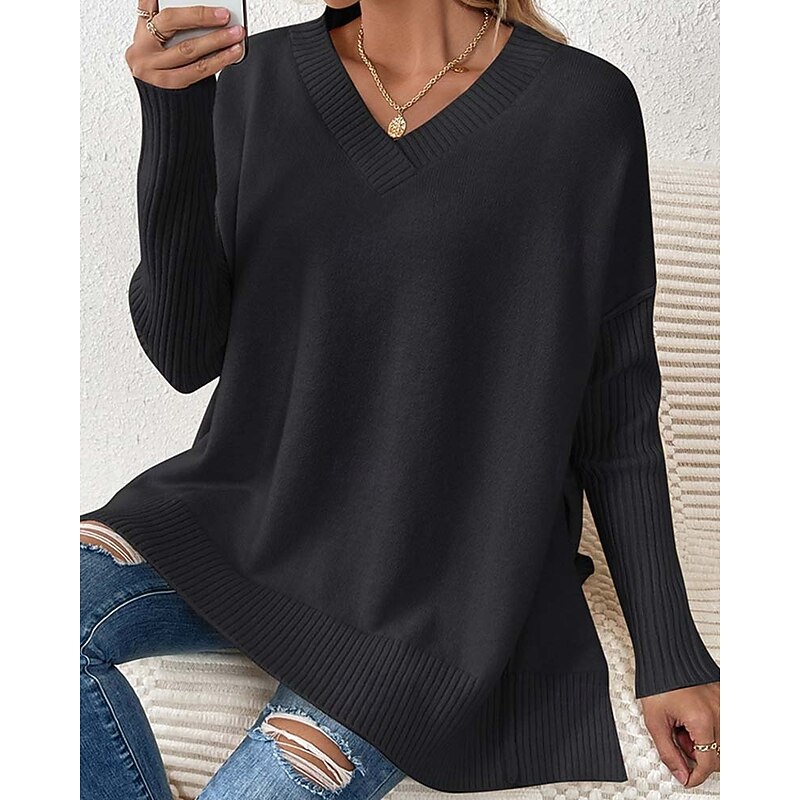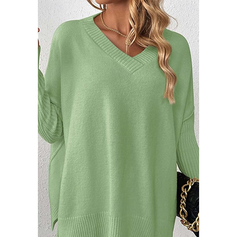 : The sweater's V-neckline is detailed with ribbed edging for added texture and a touch of elegance. The long sleeves also feature ribbed cuffs, providing subtle contrast and enhancing the overall design. Its solid color palette offers timeless appeal, available in shades like black, yellow, green, and light grey.