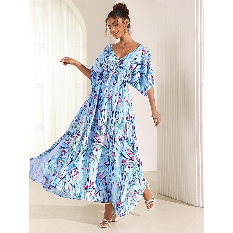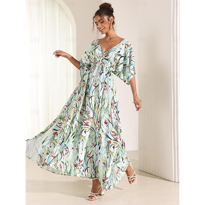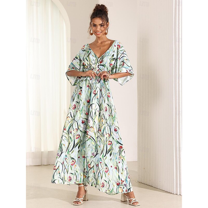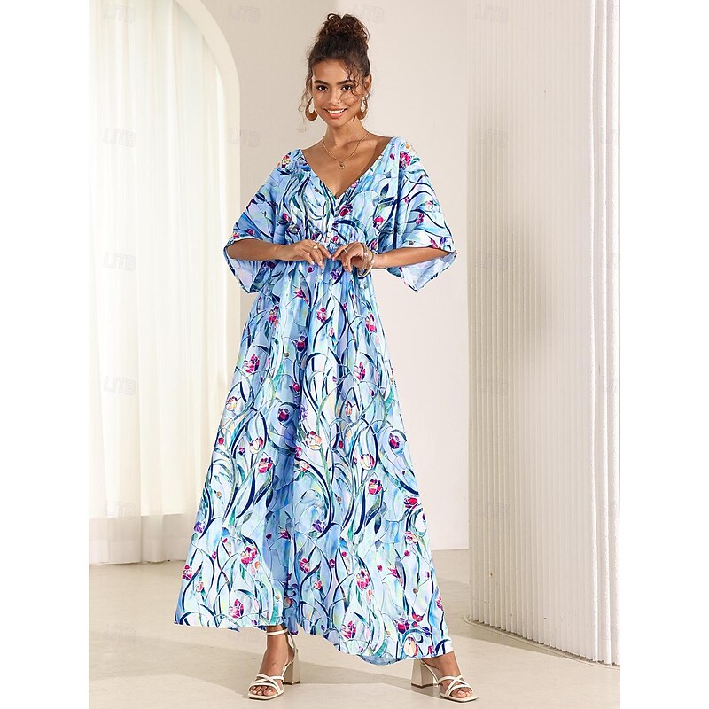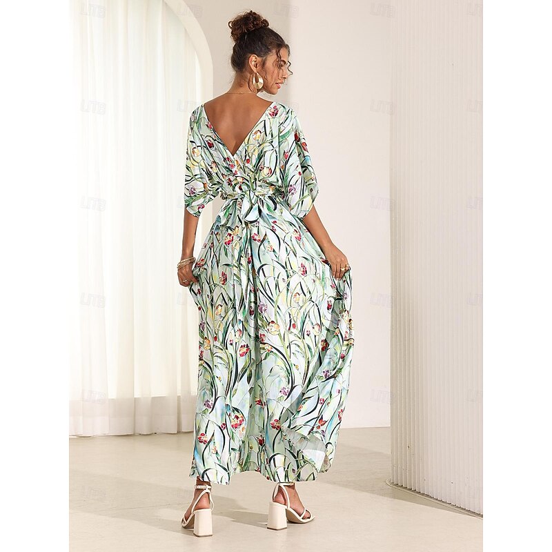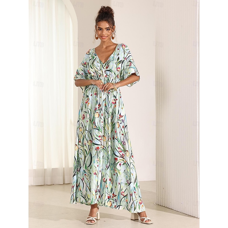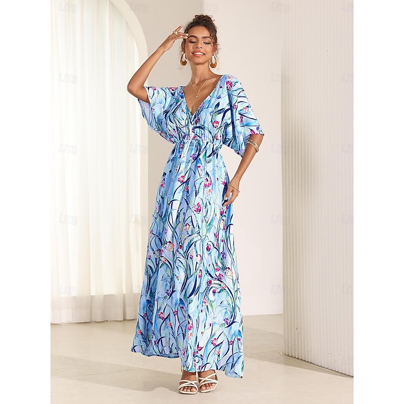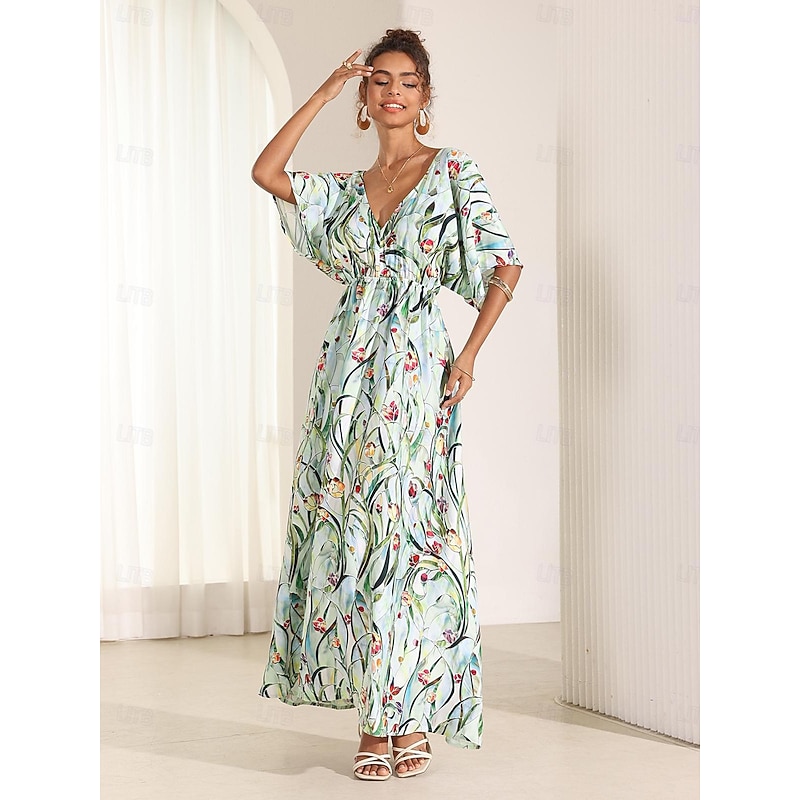 More information about Women's Midi Dress Swing Dress A Line Dress Summer Dress Elegant Bohemia Tropical Flutter Sleeve Vacation Daily Date Loose Fit Floral Short Sleeve V Neck Blue Green Summer