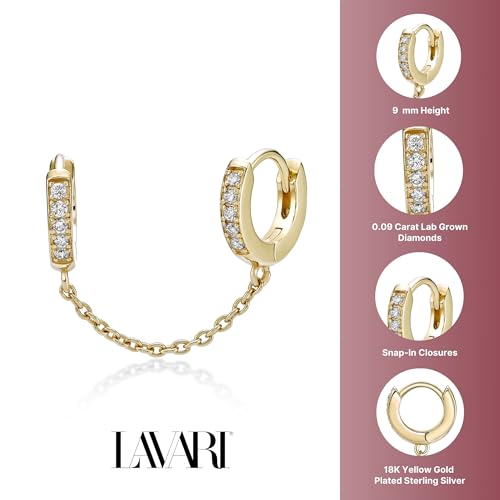 HOT ! Lavari Jewelers Lab Grown Diamond Double Huggie Hoop Single Earring for Women - 18k Yellow Gold Plated 925 Sterling Silver Chain Double Piercing Earring for Her (F-G, VS1-VS2, 0.09 cttw) Hinged Hoop