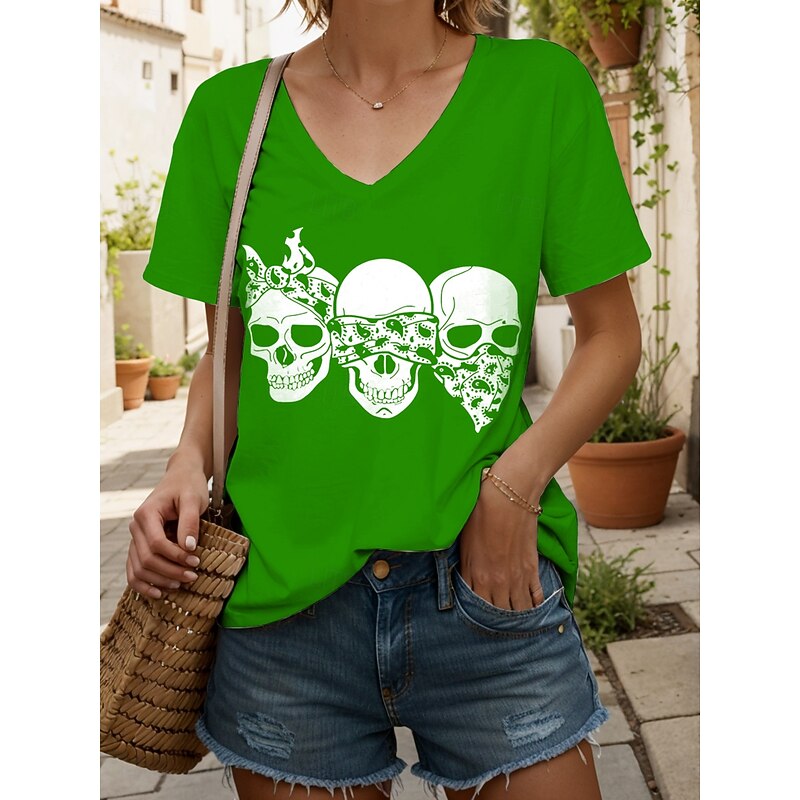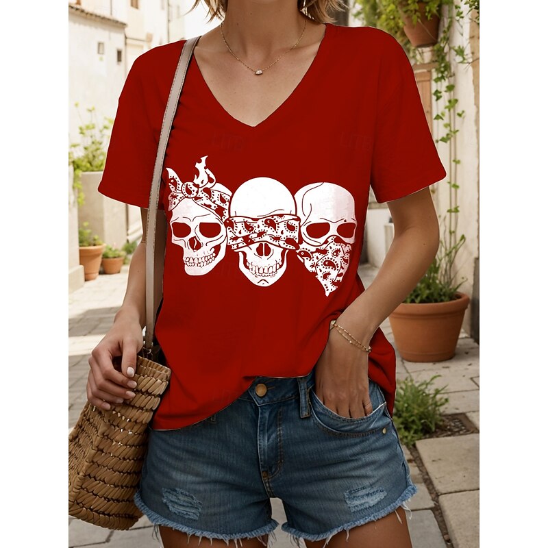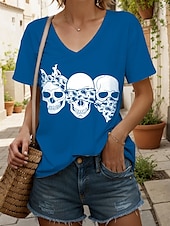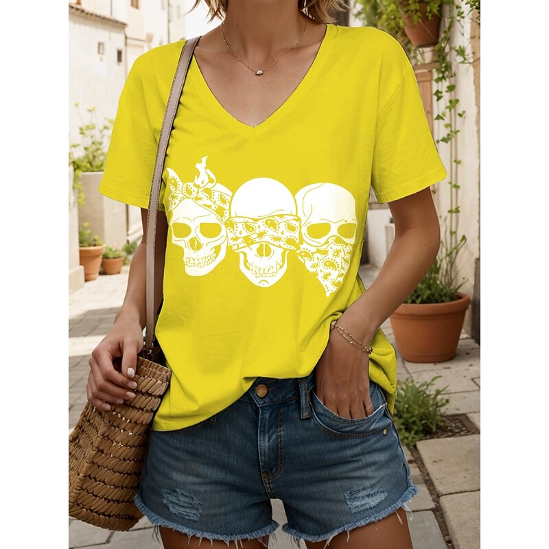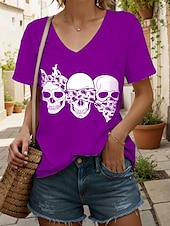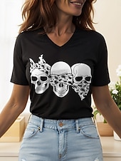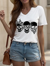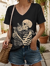 More information about Halloween Women's T Shirt Skulls Graphic Cat Vintage Stylish Classic Short Sleeve V Neck Regular Tops Daily Print Black and White Black White Yellow Pink Summer Spring