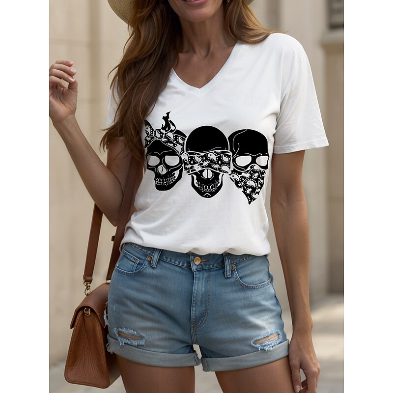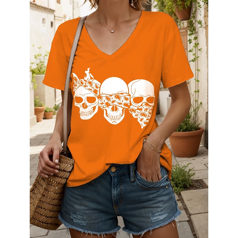 Halloween Women's T Shirt Skulls Graphic Cat Vintage Stylish Classic Short Sleeve V Neck Regular Tops Daily Print Black and White Black White Yellow Pink Summer Spring 23