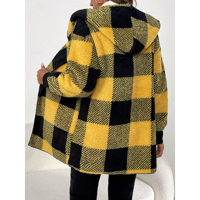 More information about Women's Fleece Jacket Sherpa Jacket Comfortable Breathable Print Open Front Casual Plaid Vacation Street Casual Daily Wear Open Front Long Turndown Regular Fit Long Sleeve Outerwear Yellow Blue Green