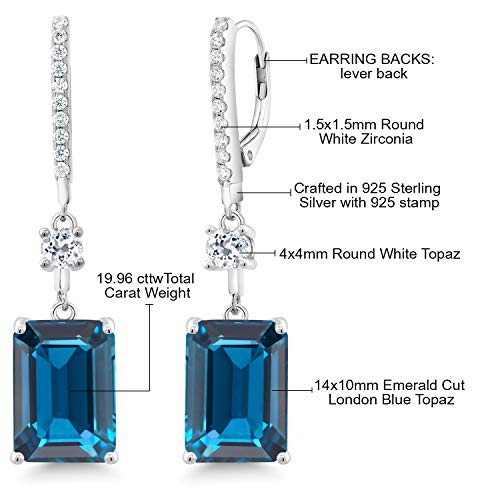 HOT ! Gem Stone King 925 Sterling Silver London Blue Topaz and White Topaz Dangle Earrings For Women (19.96 Cttw, Gemstone Birthstone, Emerald Cut 14X10MM)