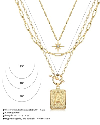 HOT ! MJartoria Layered Initial Necklaces for Women Trendy, 14K Gold Plated Brass Simple Star Choker Square Letter Pendant Necklace, Paperclip Chain Necklaces Jewelry Gifts