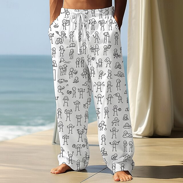 HOT ! Men's Trousers Baggy Pants Casual Pants Elastic Drawstring Waist Linen-Like Pants with Pockets People Stick Figure Full Length Outdoor Vacation Funny Black White Inelastic
