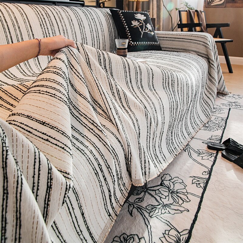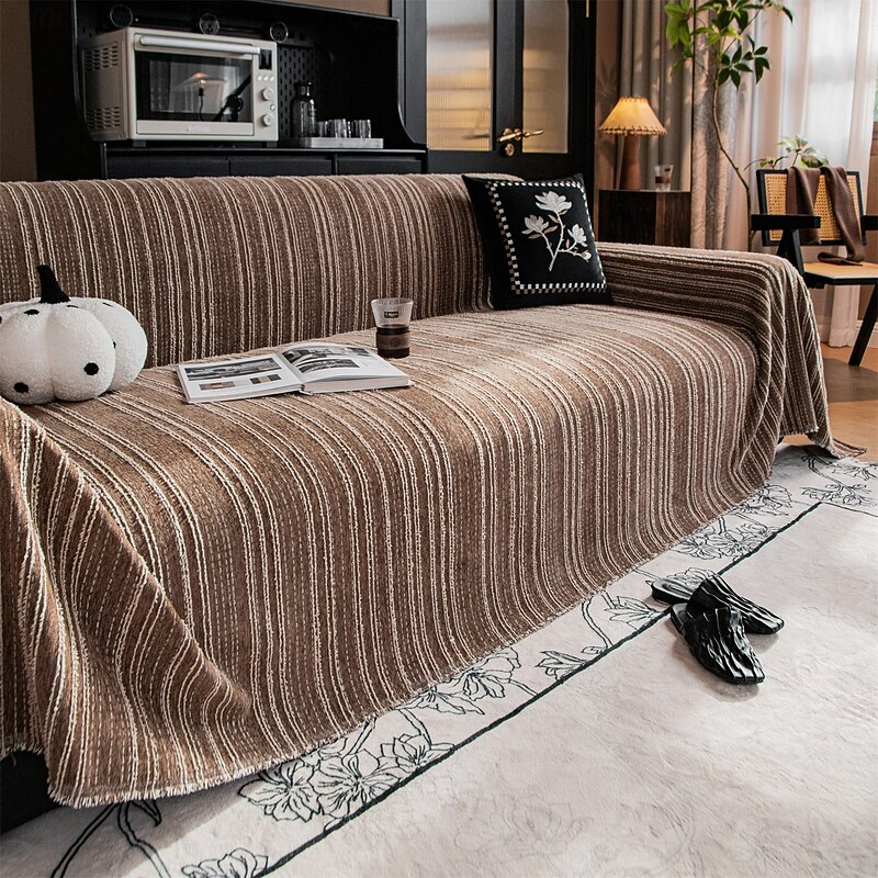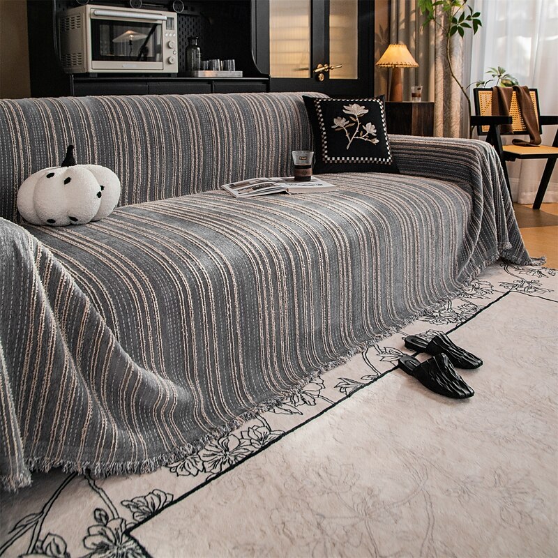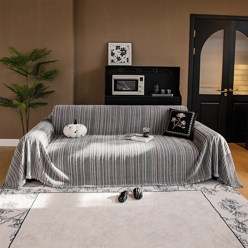 : The elegant jacquard pattern enhances the visual appeal of this universal sofa cover, ensuring it stands out as a stylish addition. The fringed detailing adds a casual yet sophisticated touch, making it an eye-catching piece in any setting.