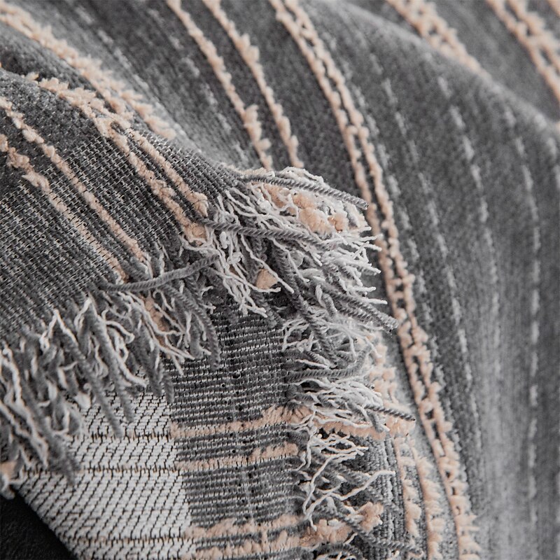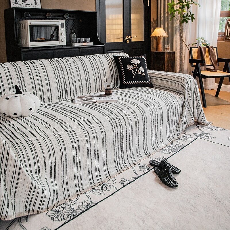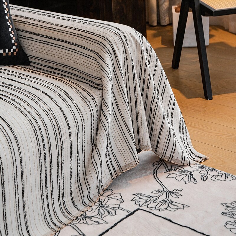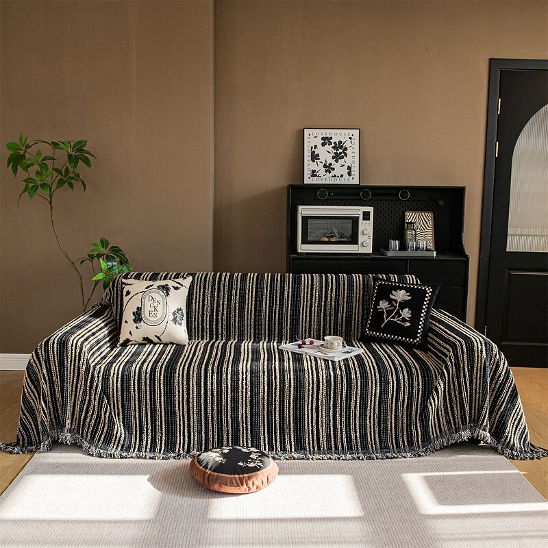: With a sophisticated black and white striped pattern, this sofa throw brings a touch of modern elegance to any living room. The fringed edges add a rustic charm, providing an inviting vibe that complements various interior styles. Its generous dimensions make it suitable for layering over any sofa, adding both style and comfort to your space.