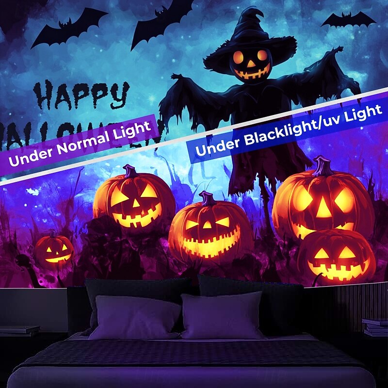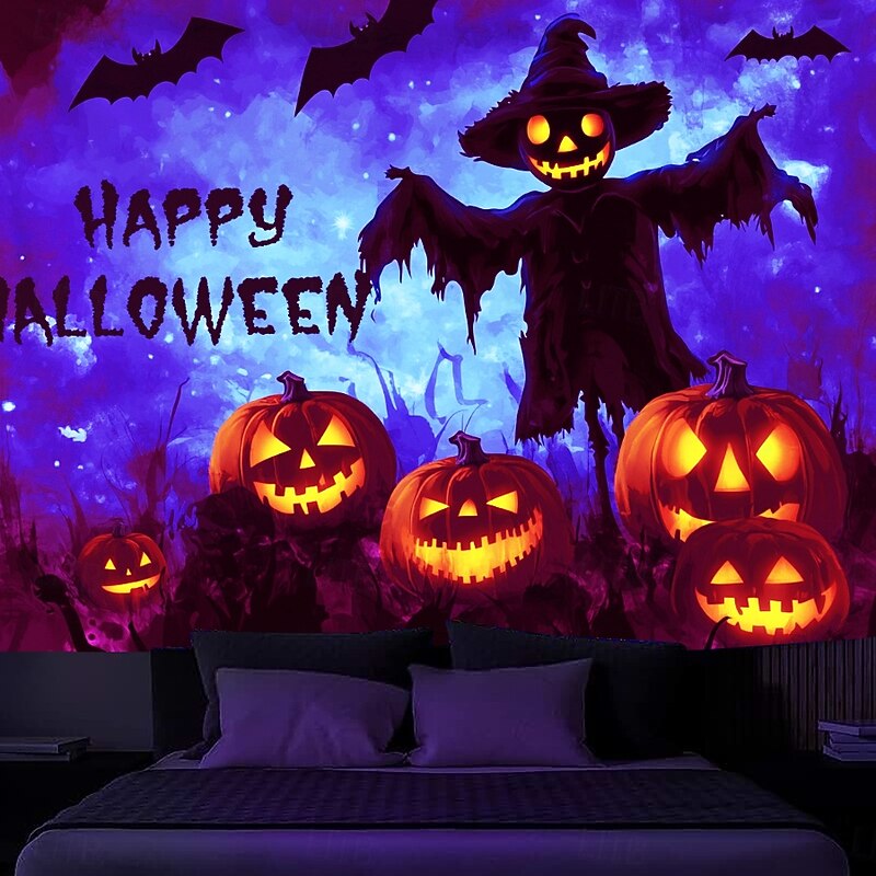 HOT ! Halloween Decorations Blacklight Tapestry UV Reactive Glow in the Dark Glow Party Skulls Psychedelic Trippy Misty Hanging Tapestry Wall Art Mural for Living Room Bedroom Pumpkins