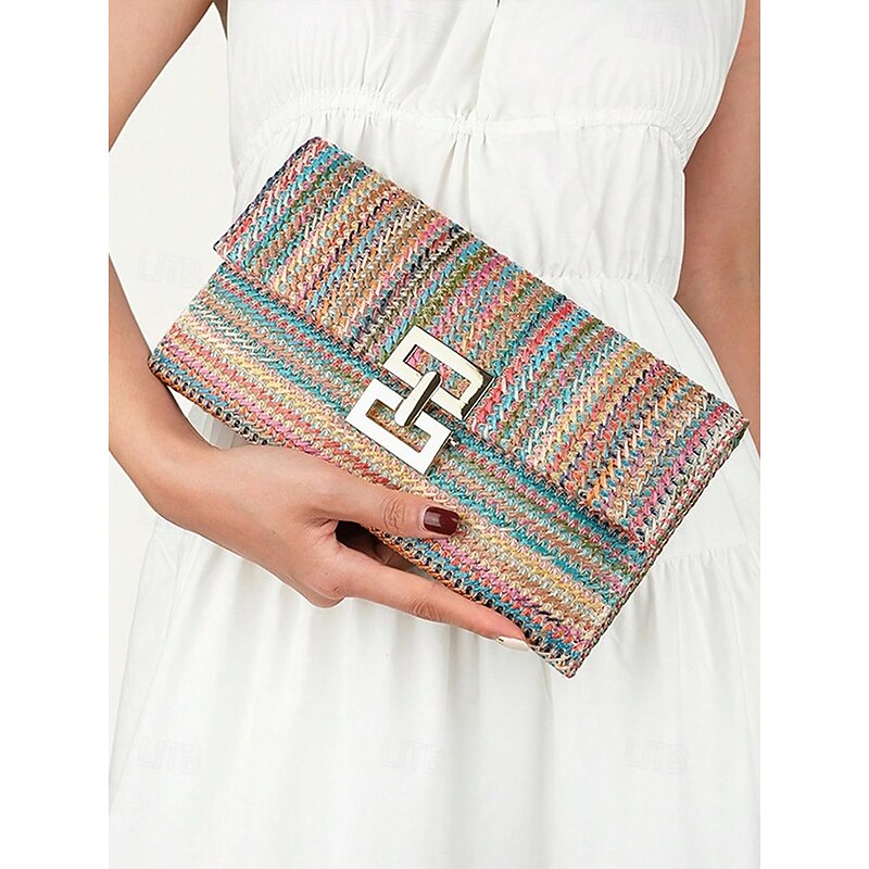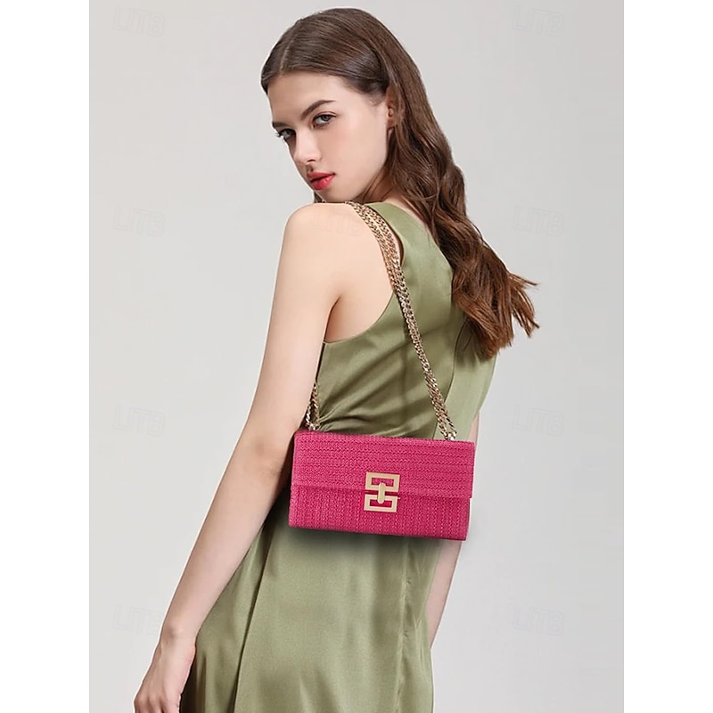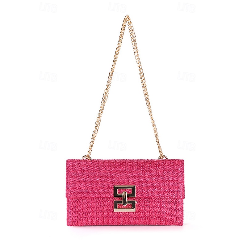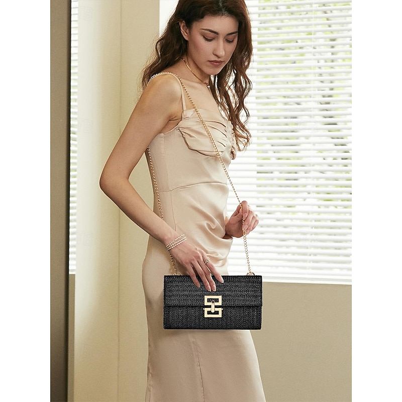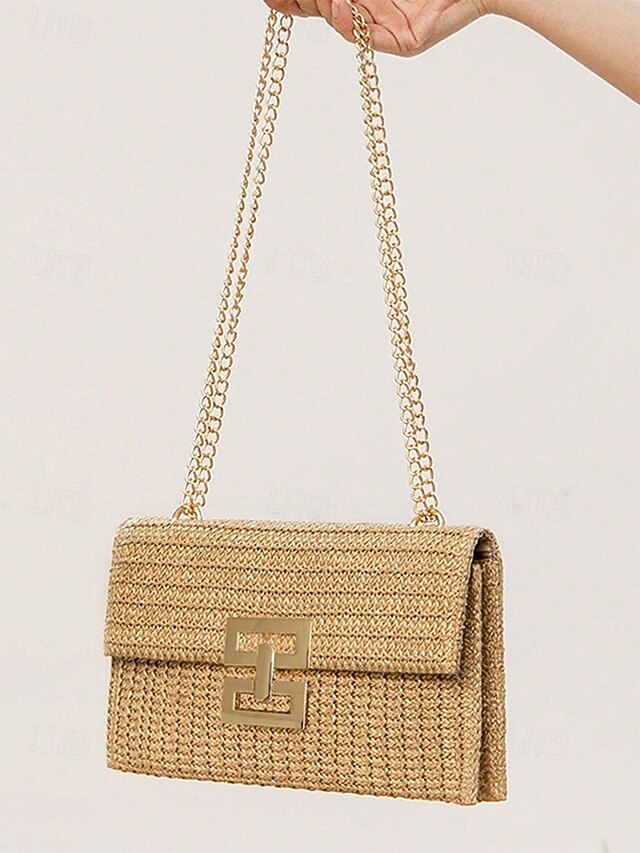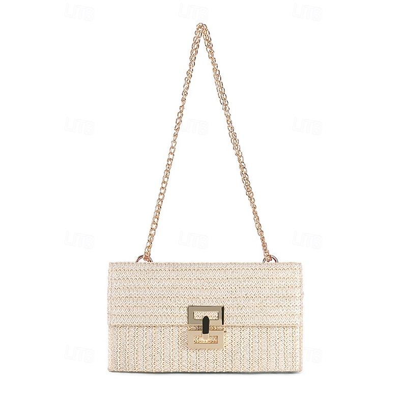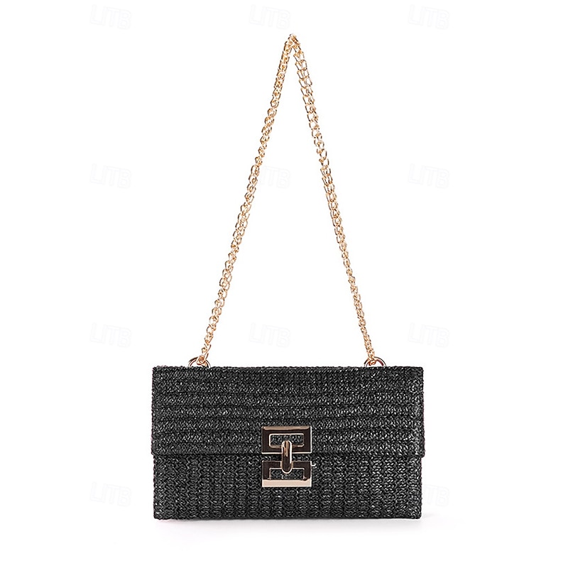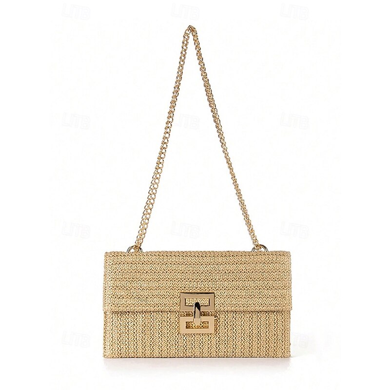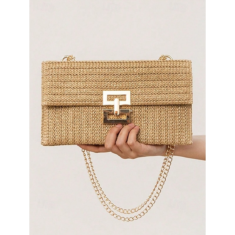 HOT ! Women's Woven Straw Shoulder Bag with Gold Chain Strap – Elegant Summer Clutch Purse for Beach, Vacation & Resort Outfits