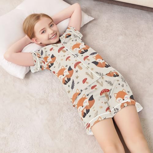HOT ! senya Serene Foxes with Mushrooms Satin Summer Pajama Sets Silk Short Sleeve Button Down Sleepwear