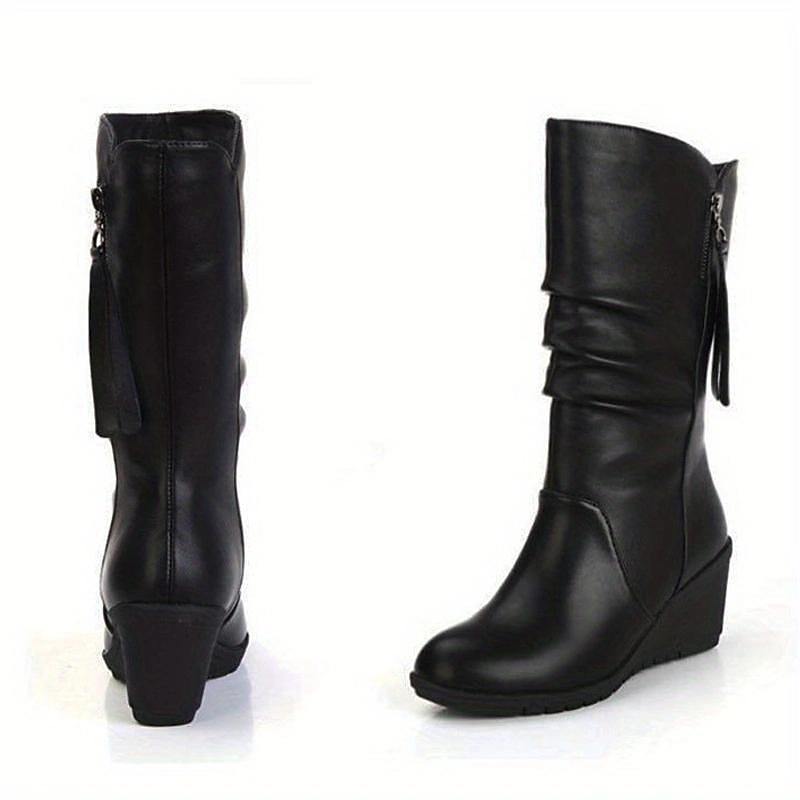 HOT ! Women's Black Mid - Calf Wedge Boots, Soft Faux Leather with Side Zipper, Stylish & Comfortable for Daily Casual Wear