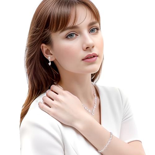 • Dainty Bridesmaid Costume Jewelry Sets for Women: Package include 1 pieces bling silver bride crystal necklace, 1 pieces silver bridal rhinestone bracelet, 1 pair rhinestone teardrop dangle earrings.