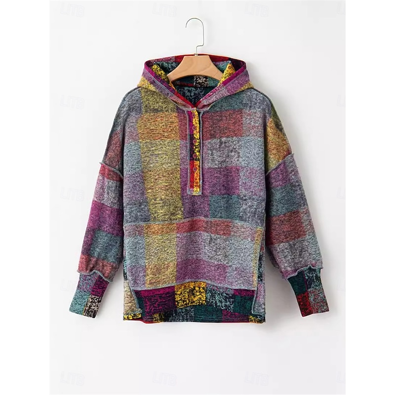 Highlights [Fabric]: Crafted from high-quality polyester, this women's hoodie sweatshirt offers a micro-elastic fit that ensures comfort and flexibility. The plaid pattern adds a touch of vibrant style, suitable for both fall and winter seasons. [Fit]: This hoodie features a regular fit with a relaxed silhouette, perfect for casual, everyday wear. The long sleeves enhance its cozy appeal, making it ideal for layering on chilly days. [Design Highlights]: The hoodie includes fashionable buttons and a practical pocket, enhancing its modern streetwear aesthetic. A unique print design lends it a stylish edge, while the hooded neckline offers additional warmth and protection against the elements. [Occasions]: Perfect for daily wear, street outings, or casual gatherings. This versatile piece seamlessly blends into active lifestyles, offering a fashionable yet comfortable option for various occasions. [Size Range]: Available in sizes S, M, L, XL, and 2XL, catering to a wide range of body types and ensuring a perfect fit for everyone.