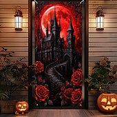HOT ! Halloween Door Cover Outdoor Banners Castle Rose Psychedelic Dark Punk Gothic Style Party Outdoor Shooting Backgrounds Front Door Wall Porch Home Decor