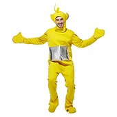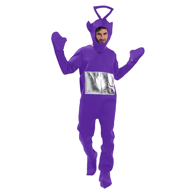 : These eye-catching costumes come in vibrant colors—purple, yellow, red, green, and blue—each adorned with a shiny, silver square detail on the front. The attached headpieces include distinctive antennas and ear-like protrusions that enhance the whimsical, character-inspired look. The ensemble is completed with fitted gloves and boot covers to fully embody the character theme.