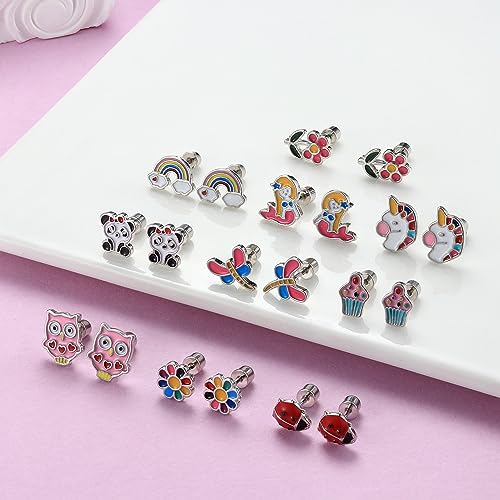 FASACCO 10Pairs Hypoallergenic Screw Back Earrings for Women Girls Stainless Steel CZ Heart Butterfly Ball Stud Earrings Multicolored Cat Rainbow Screwback Stud Earrings Set Over 3 Years Old 6