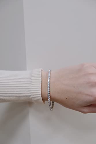• Stones: Tennis bracelet featuring round 3mm AAAAA cubic zirconia stones in four-prong basket settings. Measures 7 inches in Length