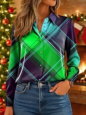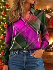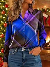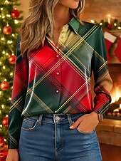 More information about Christmas Women's Work Shirt Graphic Plaid Elegant Vintage Tropical Long Sleeve Shirt Collar Regular Tops Work Party Evening Wear Daily Pink Red Blue Green Fall Winter Spring, Fall, Winter, Summer