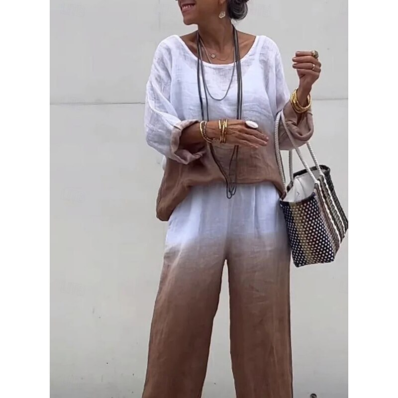 HOT ! Women's Fashion Streetwear Daily Shirt Wide Leg Pants Long Sleeve Crew Neck Ombre Drawstring Casual Daily Dark Navy Sky Blue Brown Summer Regular Fit
