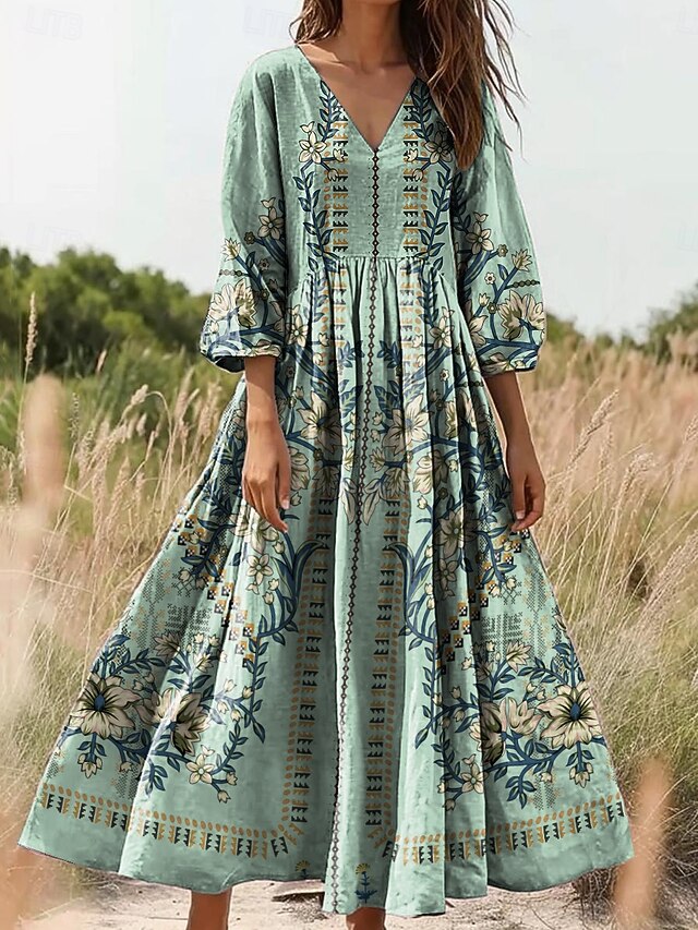 Women's Maxi Dress Sundress A Line Dress Pleated Dress Vacation Casual Boho Going out Loose Fit Floral Graphic 3/4 Length Sleeve V Neck Black Yellow Blue Green Summer Spring 3