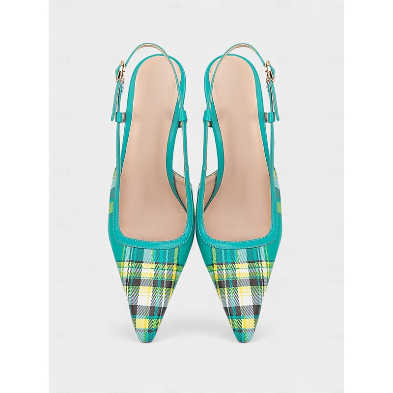 Women's Green Plaid Slingback Stiletto Heels – Retro Tartan Pointed Toe High Heels for Spring Parties, Afternoon Teas, and Vintage-Inspired Looks 1