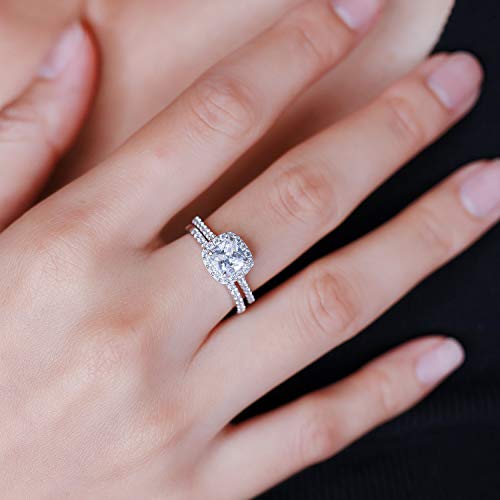 SEA OF ICE 925 Sterling Silver 6x6mm Cushion-Cut CZ Cubic Zirconia Halo Anniversary Wedding Band Engagement Ring Bridal Set, Sizes 5 to 10 3