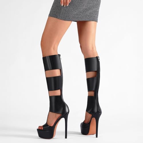 FancyQueen Platform Knee High Sandals for Women, Gladiator Open Toe Summer Boots Black Heels Sandal Booties, Sexy Style for Party, Black 9.5 6