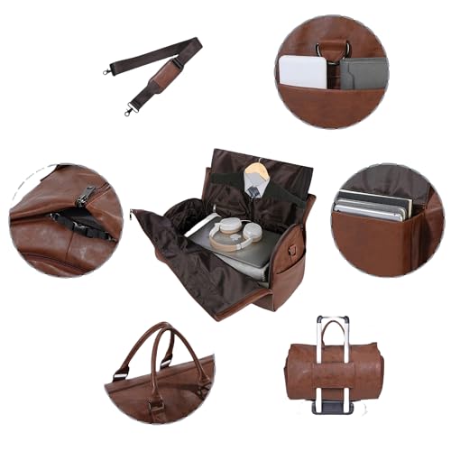 Snap on zipper suit suit travel bag carry on overnight bag waterproof leather duffel bag men and women convertible garment bag sports bag two-in-one hanging suitcase (Leather, brown), PG001 5