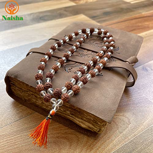 HOT ! Naisha Rudraksha & Crystal Sphatik Beads Bracelet & 108 Beads Knotted Mala Natural Himalaya 5 face Rudraksh Seed, Rosary Crystal, Wrist Mala Wrap, Bracelet Bead Size 7 mm (Pack of 2)