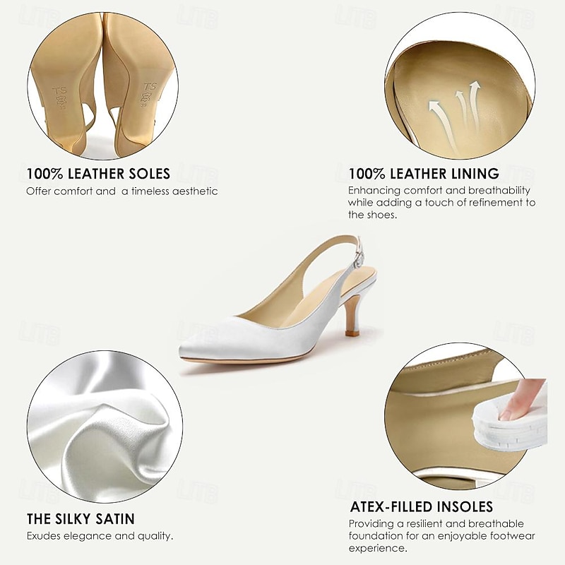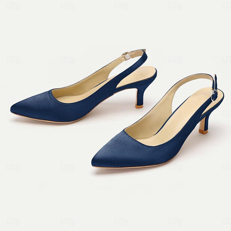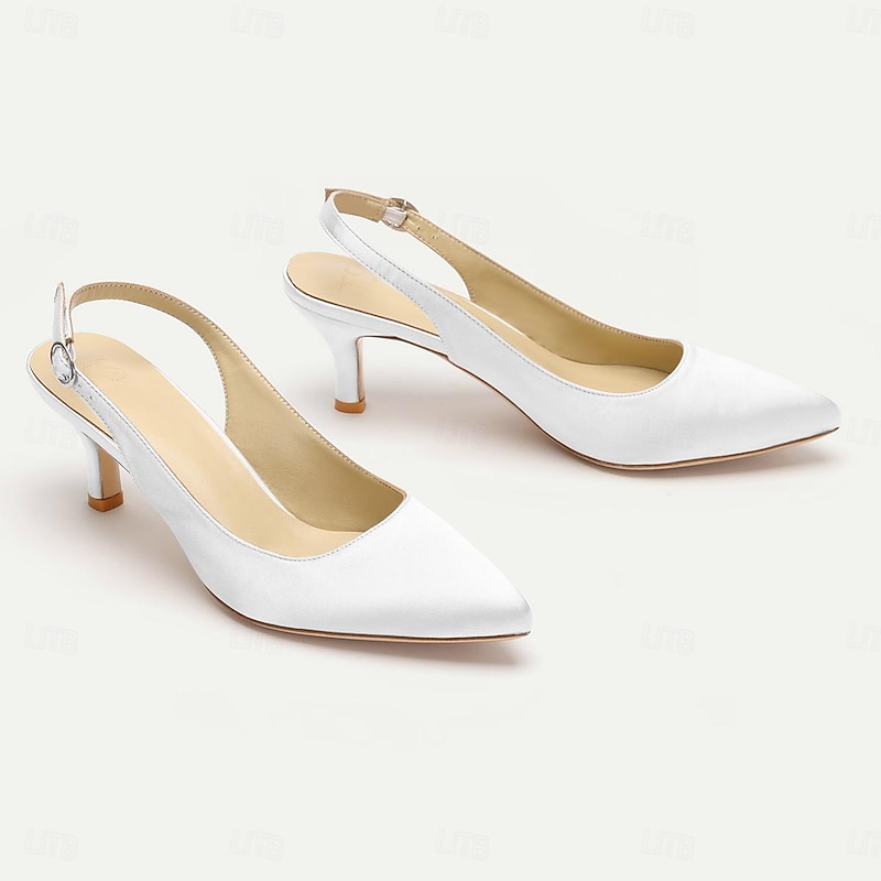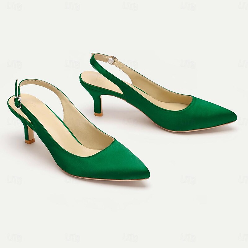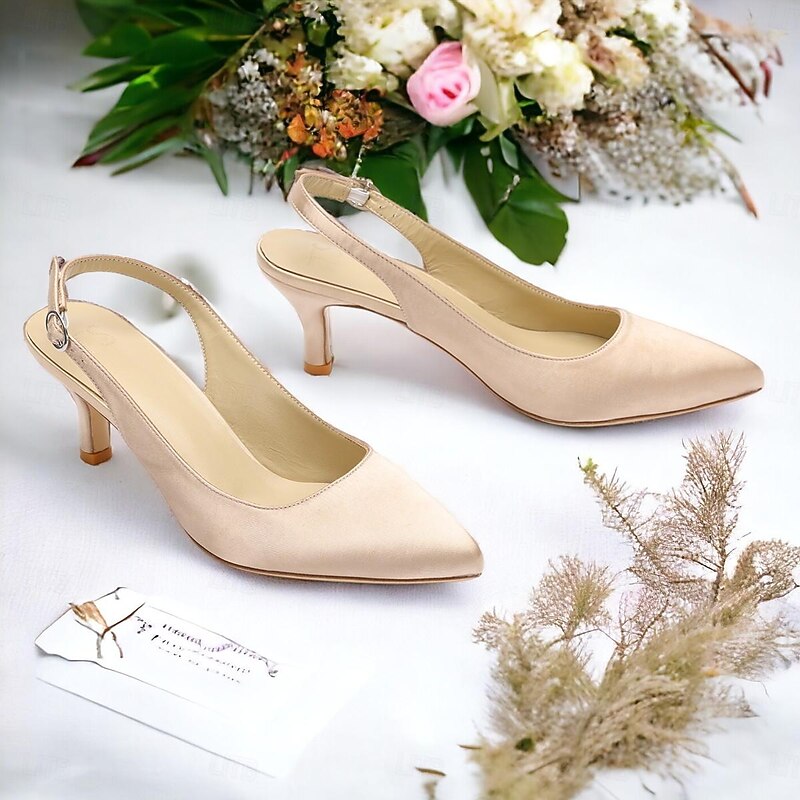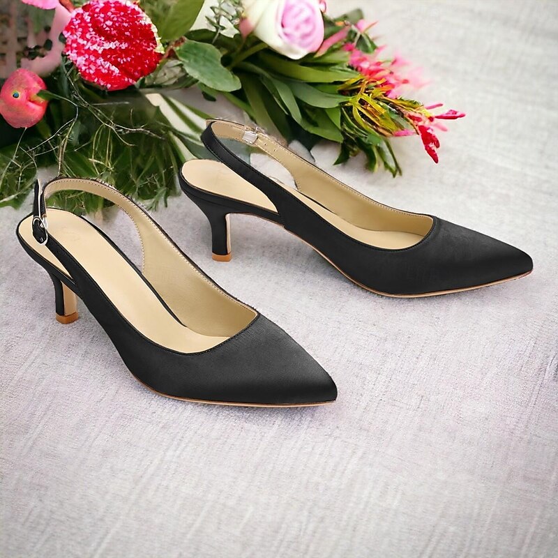 Highlights [Fabric] Crafted with smooth satin for a luxurious finish, these women's heels offer a refined look. The lining is made from 100% leather, ensuring a comfortable and breathable experience, while the outsole is also crafted from 100% leather for durability and support. [Silhouette] The pointed toe design of these shoes creates a sleek and sophisticated silhouette, complemented by a kitten heel that provides a subtle lift, offering a perfect blend of elegance and comfort suitable for long hours of wear. [Design Highlights] Featuring a classic slingback design, these shoes come with an adjustable strap for a personalized fit. The low heel, combined with the pointed toe and elegant satin, makes these shoes an ideal choice for those seeking understated sophistication with a touch of modern flair. [Occasions] Perfect for weddings, office events, parties, and other formal or semi-formal occasions. These versatile shoes add a splash of elegance to any outfit, making them a staple for festive events and professional gatherings alike. [Size Range] Available in a variety of colors including White, Black, Dark Blue, Dark Purple, Champagne, Ivory, and Dark Green. The shoes come in sizes ranging from US5 / EU35 / UK3 to US13 / EU43 / UK11, ensuring a perfect fit for a wide range of foot sizes.