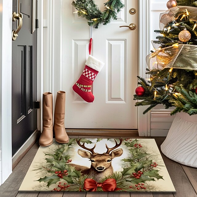 Christmas Decoration Doormat Xmas Reindeer Holly Kitchen Mat Floor Mat Non-Slip Area Rug Oil Proof Rug Indoor Outdoor Mat Bedroom Decor Bathroom Mat Entrance Rug 6