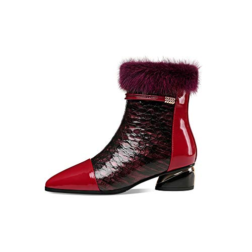 • Warm mid calf boots featured with patent leather, pointed toe, fur, side zipper and low chunky heels can make you feel comfortable with every steps
