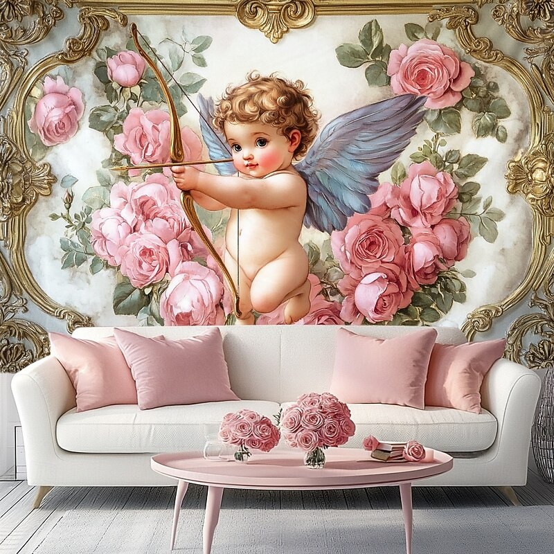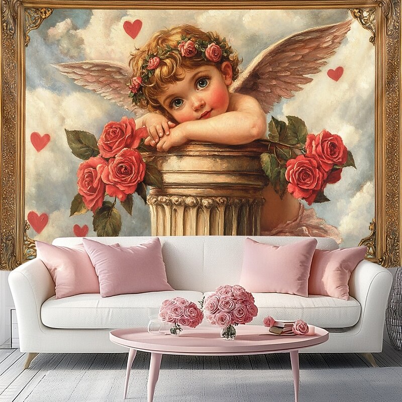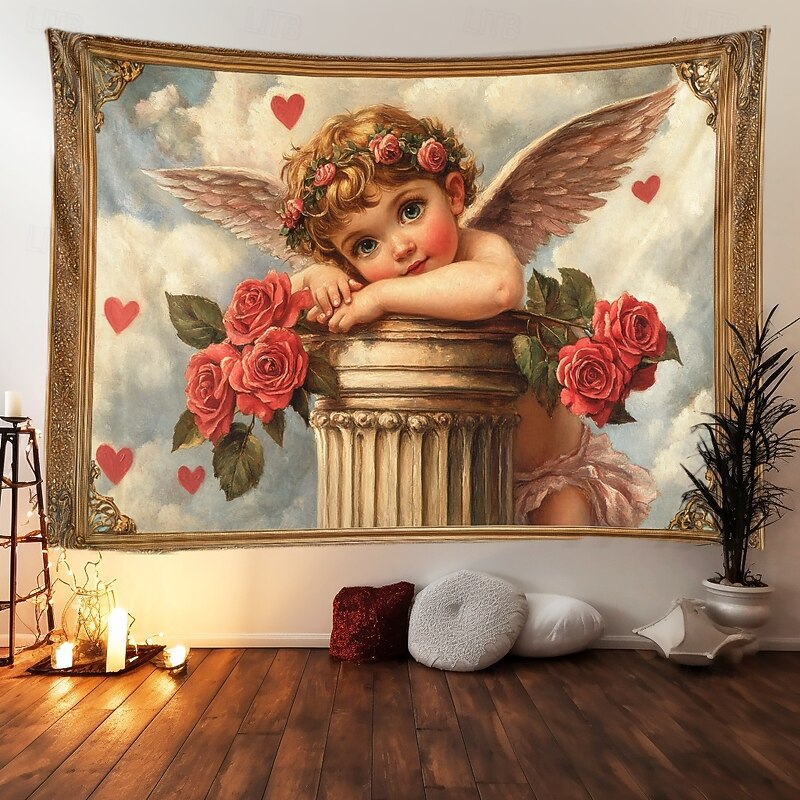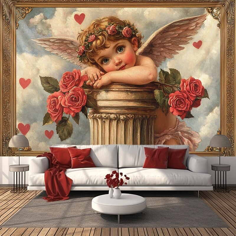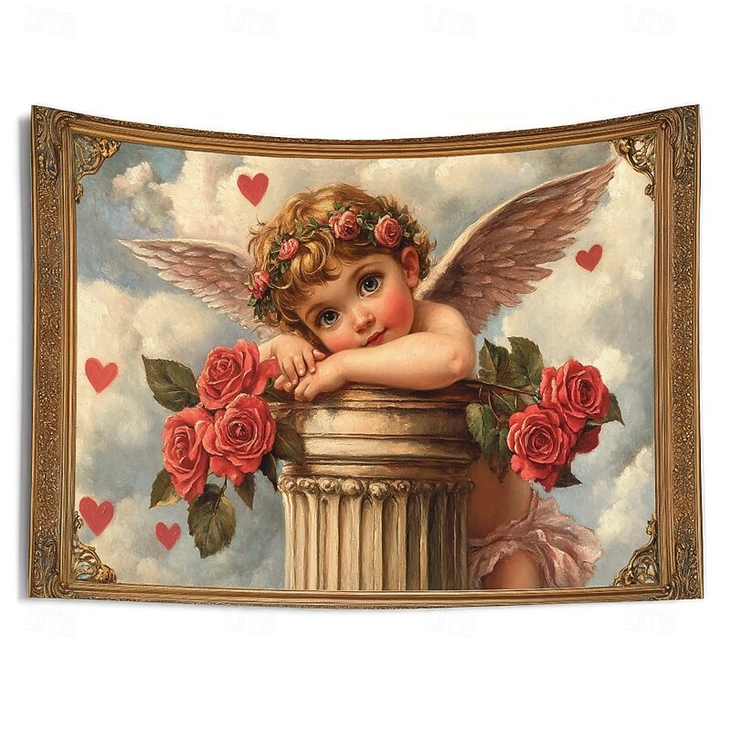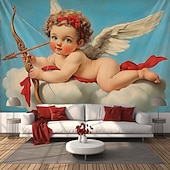 Highlights [Fabric] : Crafted from high-quality polyester, this tapestry is lightweight yet durable, ensuring vibrant colors and sharp detailing. The wrinkle-resistant material makes it easy to maintain, combining practicality with a stunning visual effect. [Design] : The tapestry features an enchanting design with a cherubic angel, capturing a scene filled with soft curls and a playful expression. The angel, surrounded by fluffy clouds and holding a classic bow, is adorned in harmonious pastel hues, adding a calming, majestic aura to your space. [Design Highlights] : This wall art beautifully blends classical themes with contemporary production techniques, offering a timeless appeal. The intricate attention to detail reflects an art style reminiscent of the Renaissance era, making it a stylish centerpiece for modern homes. [Occasions] : Perfect for transforming any living space, this versatile tapestry serves as elegant wall decor in bedrooms, living rooms, or any area needing a touch of sophistication. It acts as a conversation starter for art enthusiasts and those who value classic motifs in their home decor. [Size] : Available in a generous size of 150cm by 130cm, this tapestry is ideal for adding an impressive visual statement to your home's interior design.