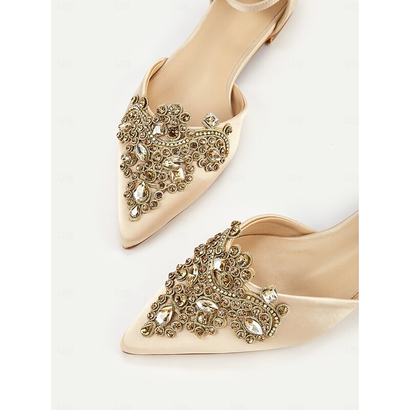 Highlights [Title] : Women's Ivory Satin Flats with Rhinestone Embellishments - Elegant Pointed-Toe Design for Weddings and Formal Events [Fabric] : Crafted from high-quality PU for the upper and lined with synthetic leather, these flats boast a smooth and sophisticated satin-like finish, perfect for adding a touch of elegance to any outfit. [Shape] : The flats are designed with a classic pointed toe, providing a chic and timeless silhouette that complements formal and stylish ensembles alike. [Design Highlights] : Featuring intricate rhinestone embellishments on the shoe's upper, these flats add a glamorous sparkle. The adjustable ankle strap, with its buckle closure, ensures a secure and personalized fit, enhancing both style and comfort. [Occasions] : These elegant flats are ideal for weddings, formal events, and stylish parties. Their versatile beige color makes them suitable for pairing with a variety of outfits, ensuring you look polished and refined on any special occasion. [Size Notice] : Available in a range of sizes from US5 to US13 (EU35 to EU43), these flats are designed to fit standard sizes. It is recommended to select your usual size for the best fit. The flat sole structure offers comfort for extended wear.