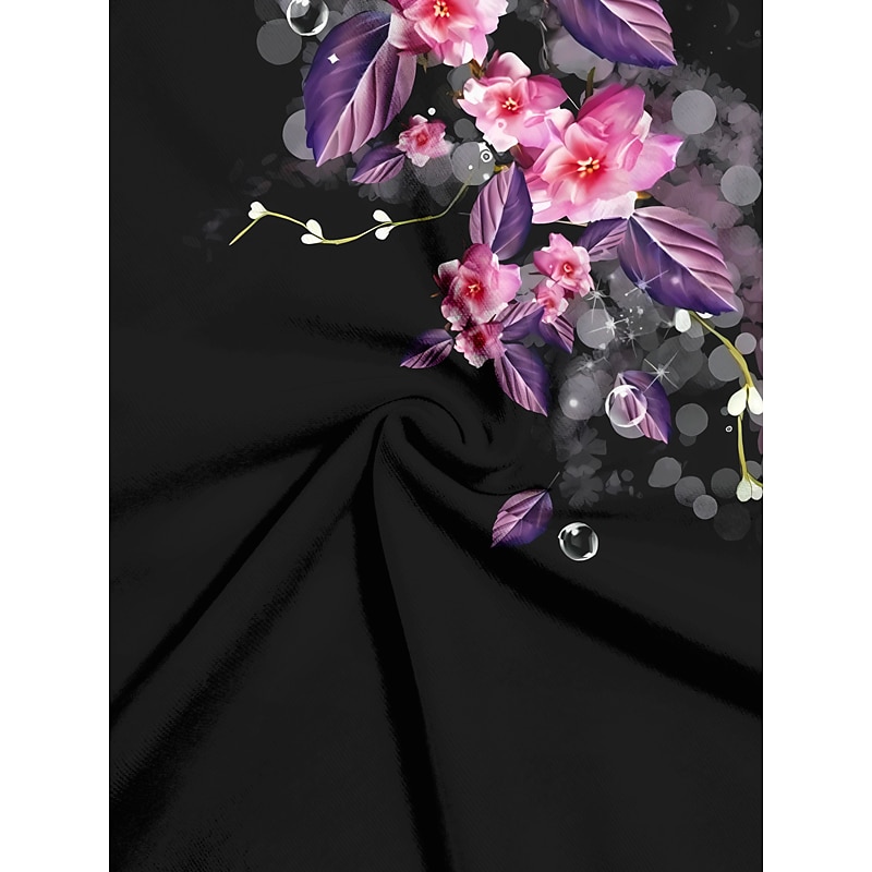Highlights [Fabric] Crafted from high-quality polyester, this women's t-shirt offers a breathable and comfortable wear with its micro-elastic fabric. The soft material ensures it remains a staple in your casual wardrobe throughout the seasons. [Fit] Featuring a regular fit, this top provides a relaxed, laid-back appearance that is both chic and comfortable. Its short sleeves make it ideal for warmer days, while the regular length ensures versatility in styling. [Design Highlights] The t-shirt stands out with its lively floral print of vibrant pink and purple hues against a classic black background. The round neckline and 3D print add a modern touch to this basic tee, making it distinctive yet easy to wear. [Occasions] Perfect for holidays, weekends, and relaxed outings, this t-shirt effortlessly suits a variety of casual events. Whether you're headed for a weekend getaway or a laid-back holiday adventure, it pairs beautifully with jeans or shorts for a stylish ensemble. [Size Notice] Available in a wide range of sizes from S to 3XL, ensuring a fit for various body types.