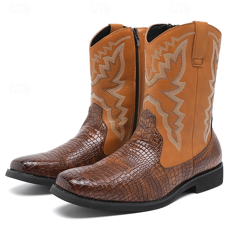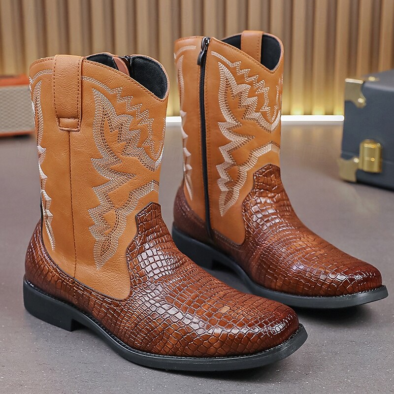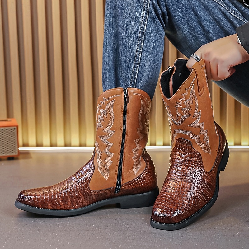 Men's Brown and Crocodile Print Western Cowboy Boots with Embroidered Details, Square Toe, Durable Outsole, Stylish Rodeo Footwear for Horse Riding, Line Dancing, Country Weddings and Outdoor Events 35