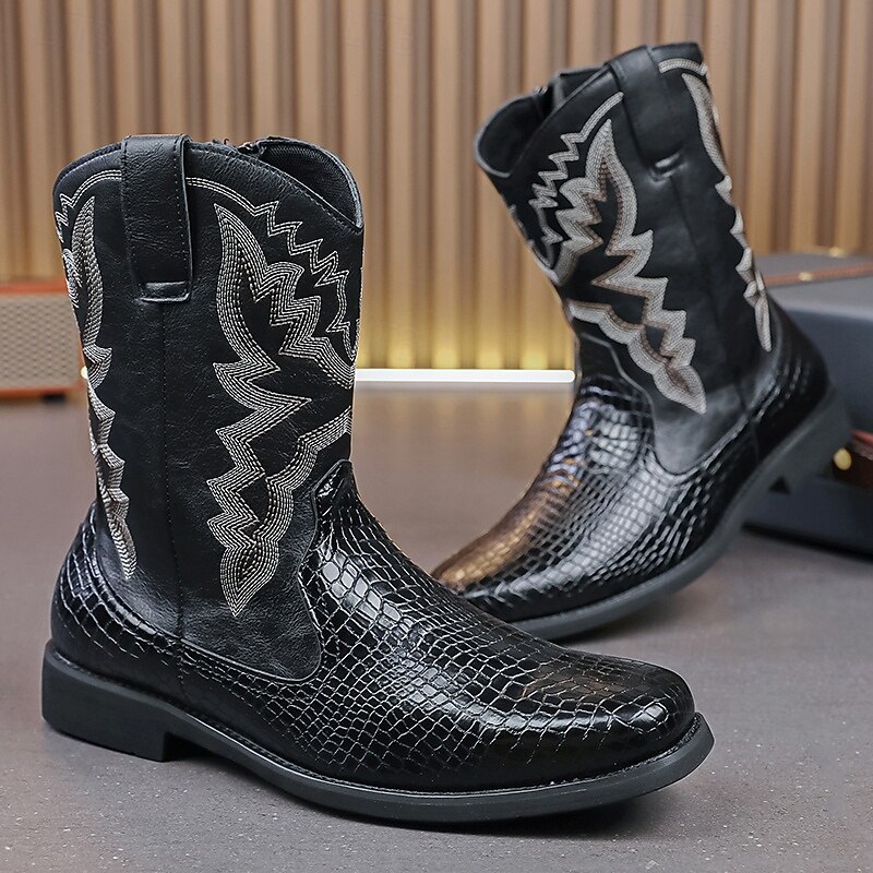 Men's Brown and Crocodile Print Western Cowboy Boots with Embroidered Details, Square Toe, Durable Outsole, Stylish Rodeo Footwear for Horse Riding, Line Dancing, Country Weddings and Outdoor Events 1