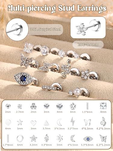 • Tiny Stud Earrings Size:Gauge:20G(0.8mm) pin thickness, Post Length:6mm,flatback size:5mm,lightning:7*3.2mm;flower:5mm; heart:3mm;Snake:8*4.3mm,etal.Lightweight flat back gold/silver cartilage earring sets for multiple piercing,well fitted,doesn't put any strain on the ear.